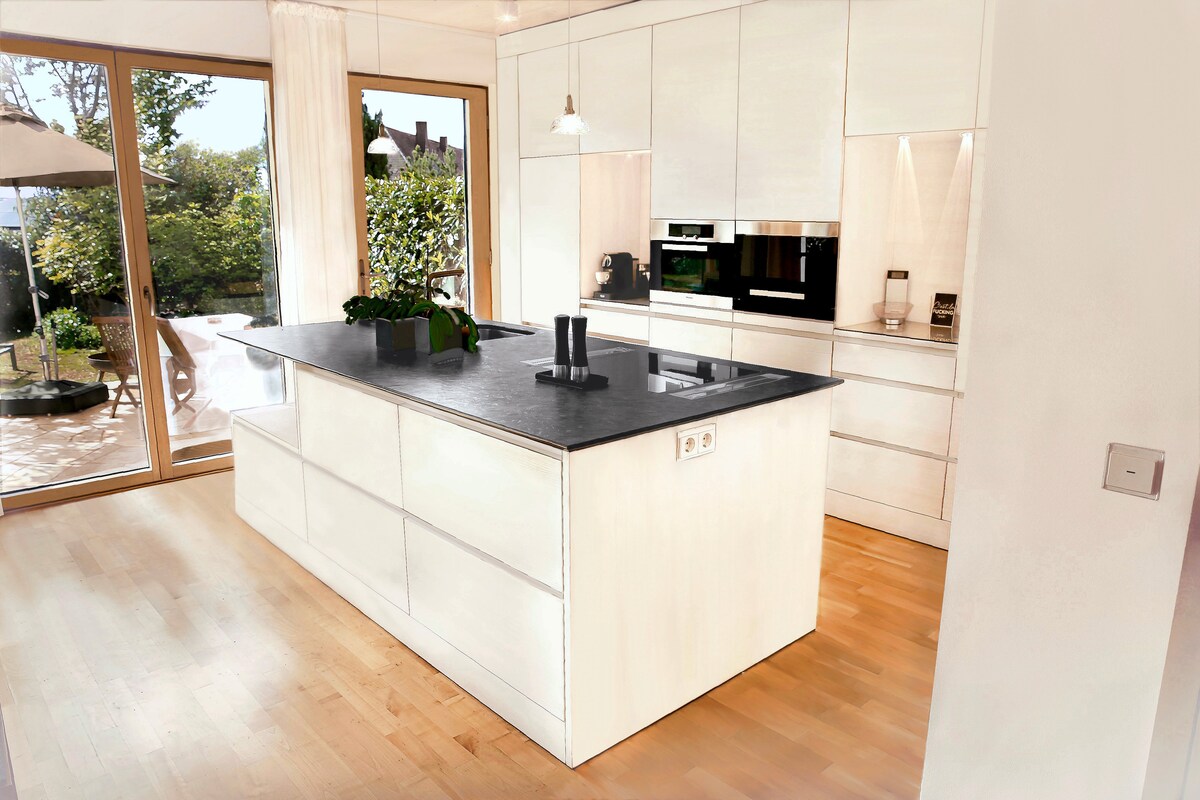 Ang ground floor apartment ay matatagpuan sa isang dating farmhouse at ganap na bagong inayos. Angkop ito para sa 2 -3 tao. Ang bahay ay may malaking hardin na may iba 't ibang mga seating area para sa shared na paggamit, pati na rin ang garahe sa bahay. Sa paligid ay may mga pasilidad sa pamimili para sa iyong mga pang - araw - araw na pangangailangan. 5 minutong lakad ang layo ng city park (Japanese garden) sa tabi ng outdoor swimming pool.