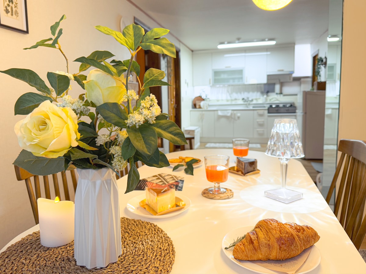 가족 및 단체손님에 적합한 넓은 숙소로 편안하고 위생적인 숙소를 위해 고급 침대 프레임 및 이태리산 재질의 매트리스, 항균 오가닉 이브자리 브랜드 침구를 구비. 5층 숙소 외에는 입주민이 없어 상가와 사무실이 문닫는 밤시간은 소음걱정없이 프라이빗한 도심속 안식처가 됨. 3개의 침실, 침대 4개, 7인 이용, 8인인 경우, 1인용 추가 메모리폼 매트리스를 제공. 다양한 채널을 시청할 수 있는 55인치 스마트 TV와 소파가 있는 거실, 6인용 큰 테이블과 여분의 벤치 등이 있어 가족 및 단체 모임에 적합. 완벽한 주방과 조리도구 구비, 제대로 요리를 할 수 있습니다. (전자레인지, 가스레인지, 토스터기, 냉장고, 얼음 냉온정수기, 전기주전자, 10인용 전기밥솥) 숙소 무료주차장 2대까지 가능. 합법 공유숙박 업소로 내외국인 모두 이용가능. 위홈에서 숙소번호 2029862 를 검색하여 예약가능 2인까지 기본요금, 2인 초과시 1인당 2만원 추가요금 적용