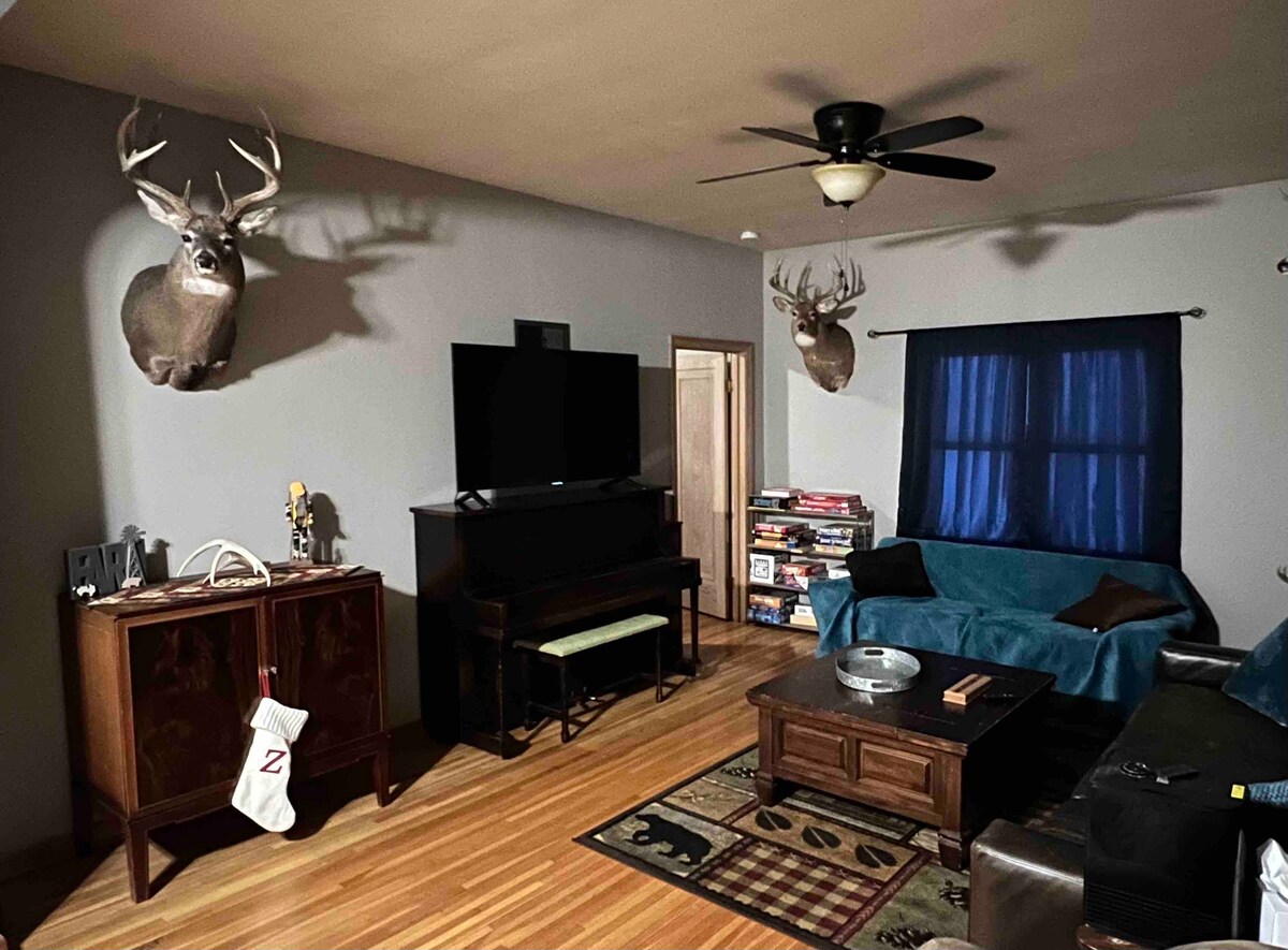 Your family will be close to everything when you stay at this centrally-located place. Located walking distance from downtown, this home has beautiful bluff views. Cuddle up on our reclining couches while enjoying our free WIFI. We have 2 queen beds and one twin bed. We also have a queen air mattress available for use. Contactless entry.