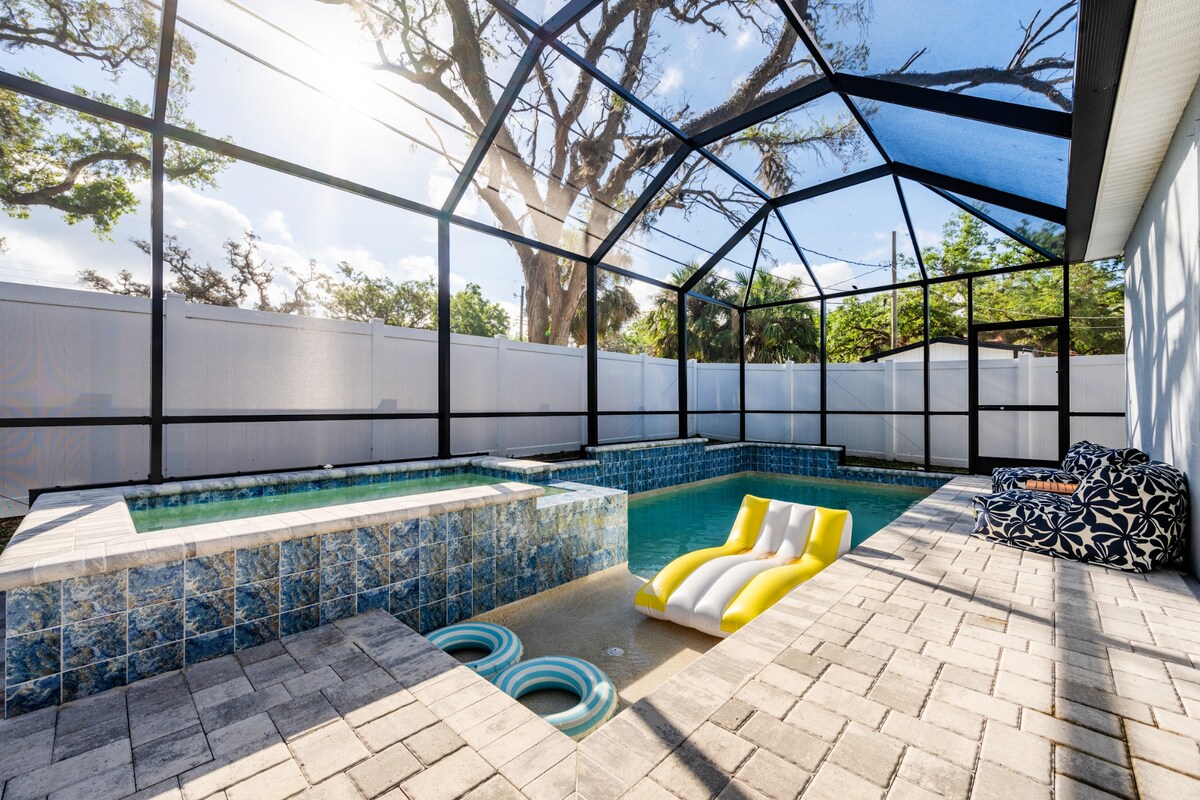 Tuklasin ang kagandahan ng three - bedroom, two - bathroom bungalow na ito – isang marangyang kanlungan kung saan nakakatugon ang estilo sa pagrerelaks. Masiyahan sa mga sandali ng katahimikan sa tabi ng spa at naka - screen na pool, na kumpleto sa mga nakakaengganyong swimming - up barstool, o magpahinga sa masayang hot tub na tumatanggap ng hanggang walong bisita. Pumunta sa tahimik na oasis sa labas, na pinalamutian ng mga eleganteng muwebles sa kaakit - akit na likuran ng bakod na bakuran. Naghihintay ang iyong bakasyon, na matatagpuan nang maginhawang malapit sa mga pangunahing atraksyon ng lungsod.