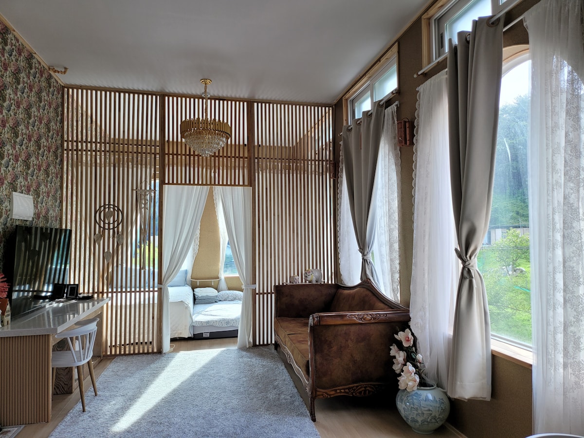 Hello ~ Ito ang Dhaoda Stay ^ ^ Matatagpuan sa loob ng Chiaksan National Park, isa sa pinakamagandang likas na yaman. Sa tag-init, puwede kang mag-enjoy sa paglalaro sa tubig sa lambak sa harap mismo ng tuluyan, at ligtas na ligtas ito kahit tag-ulan. Kung susuwertehin ka sa taglamig, makakakita ka ng niyebe, at napakaganda ng tanawin ng niyebe sa labas ng bintana. Maganda ang tagsibol at taglagas na may mga halaman at dahon ng taglagas. May cafe (Dasioda) at mga common area sa unang palapag, at may mga matutuluyan sa ikalawang palapag. May playroom sa isang bahagi ng unang palapag at maliit na palaruan sa bakuran para maging masaya ang mga bata. ※ Kasalukuyang pansamantalang sarado ang cafe, kaya mas komportable mong magagamit ito ^ ^ May 55-inch TV at smart TV na may Netflix, at may moonlight bowling stick game machine at mga board game, kaya hindi ka magkakaroon ng oras para maging nababato. Inihanda ang barbecue space para magkaroon ng dating na parang nagkakamping, at may rooftop din kung saan puwedeng tumingin sa mga bituin. Kahit hindi ito perpekto, palagi naming susubukan na gawin itong pinakamagandang tuluyan para sa aming mga bisita.