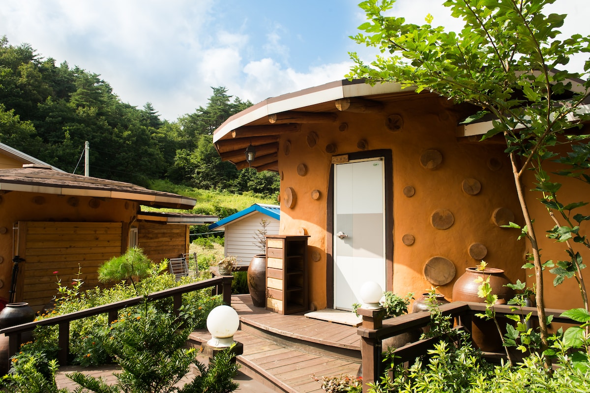 Ito ay isang dumi ng bahay na gawa sa mga domestic pines, mga puno ng pino, mga puno ng sipres, at domestic loess, kaya ang bawat isa sa kanila ay inilatag na may kahoy na panggatong. Isa itong tradisyonal na bahay sa lupa sa Korea na may magandang tanawin ng kalangitan sa gabi na may malaking bintana sa kuwarto. Kung nais mong i - drop ang lahat ng bagay para sa isang araw at matugunan ang iyong sarili sa isang abalang buhay, kaya kung nais mong magkaroon ng isang tunay na pahinga, kumuha ng isang paglalakbay upang makakuha ng iyong bahay sa isang hwang dumi bahay na may kalikasan sa iyong mga armas ^^ Maging masaya ^^ Ang sound room★ ng dahon ng damo ay angkop para sa 2 matanda + 1 bata. Mahigit sa 3 may sapat na gulang, angkop ang tunog ng tubig. Isa itong Earthhouse sa notasyon ng★ Airbnb, at nagbibigay kami ng ondol at duvet sa halip na higaan. Depende sa★ panahon, bibigyan ka namin ng libreng hardin, gulay, at puwede kang mag - barbecue.