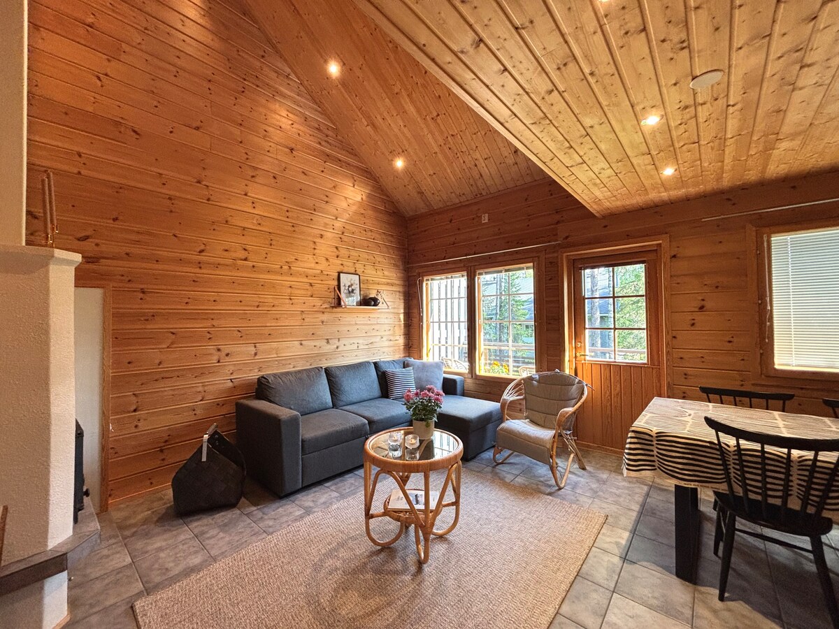 Nagbibigay ang cabin ng mga komportableng tuluyan at kusinang may kumpletong kagamitan kung saan makakapaghanda ka ng masasarap na pagkain pagkatapos ng mahabang araw. May dalawang silid - tulugan sa unang palapag, na ang isa ay may mga hiwalay na higaan. Sa itaas ay may malaking bunk bed, WC at fold - out futon sofa para sa dagdag na kama. Matatagpuan ang sauna sa hiwalay na gusali sa labas, na mapupuntahan sa pamamagitan ng glazed terrace. Matatagpuan din ang fireplace sa labas sa terrace, kung saan masisiyahan ka kahit sa pinakamalamig na gabi.