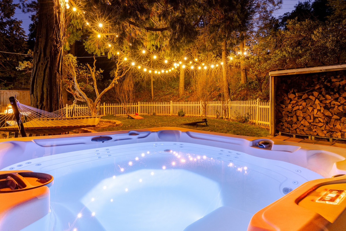 LOCATION!!! Yosemite National Park & Bass Lake close! Stylish Retreat with Gorgeous tree views, indoor jacuzzi bathtub, primary BR with onsuite Bath and slider access to outdoor color changing Hot tub in a Fenced grassy back yard with tree strung market lights, deck, hammock, water feature, firepit and stars! Ample kitchen supplies, High quality bedding, board games, DVD/ movies, fast internet TV's, firewood for fireplace. Location 20 minutes to Yosemite South Gate!! Large driveway.
