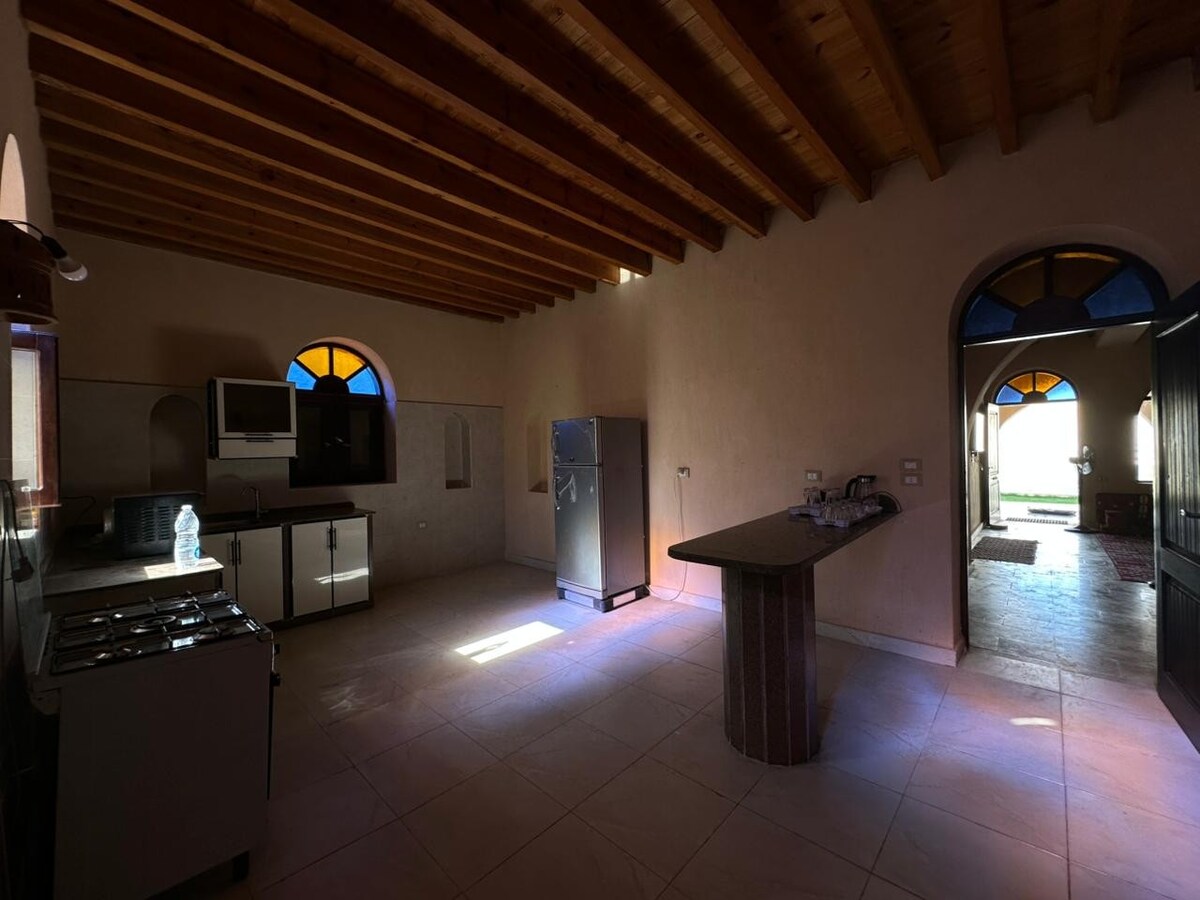 Welcome sa Villa Kemet na idinisenyo ng lokal na arkitekto (mga vault, may kulay na bato, karaniwang mastaba sa Fayoum). Tahimik sa probinsya pero malapit sa lahat ng amenidad (5–10 minuto kung maglalakad), mag-enjoy sa pribadong pool at landscaped na hardin na may BBQ, mga sun lounger, at kahoy na mesa. Komportable at maluwang na villa na may eksklusibong dekorasyon: 4 na kuwarto, 2 kusina, 2 sala, fireplace, at 3 banyo/toilet—kumpleto ang lahat para makapagpahinga ka.