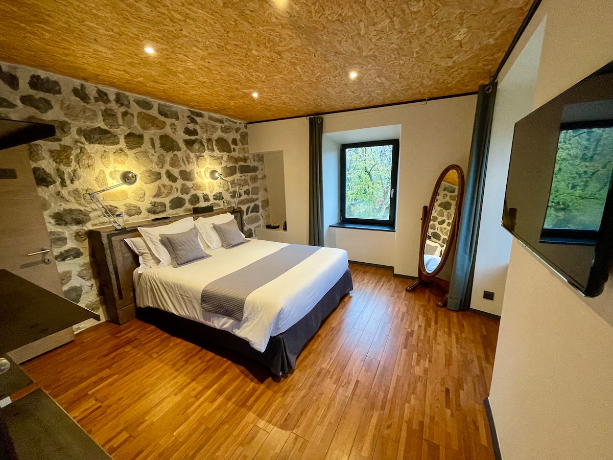 Pinagsasama ng 56m2 suite na ito, na nagbibigay ng access sa pribadong terrace na may higit sa 15m2 na may mga tanawin ng lawa, ang kontemporaryong estilo at karakter ng mga lumang bato. Ang isang malaking glass surface na hindi napapansin ay magbibigay - daan sa iyong maramdaman sa gitna ng kalikasan. Maaari kang magrelaks sa pyramid fireplace (naiilawan mula Oktubre hanggang katapusan ng Abril) pati na rin sa pribadong spa ng suite (jacuzzi). Mag - aalok ng almusal na may matamis o masarap na opsyon ayon sa iyong mga preperensiya.