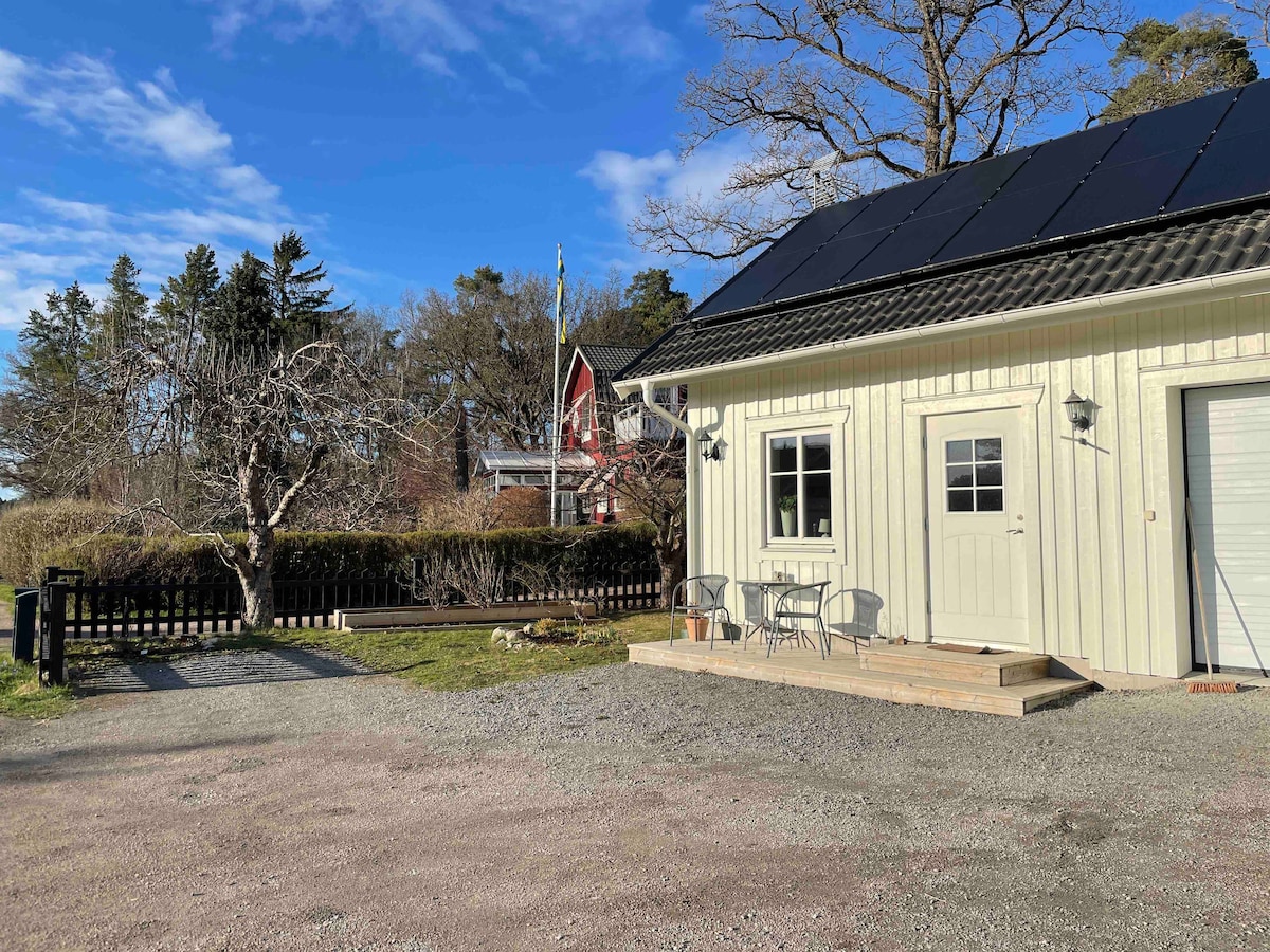 Maliit na maaliwalas na guest house sa isang luntiang lagay ng lupa. 400 metro mula sa cottage ang Lake Mälaren. Dito maaari kang lumangoy sa pamamagitan ng isang jetty o maliit na beach sa tag - araw at mag - skate sa taglamig. Malapit sa magandang nature reserve na may mga barbecue area at magandang kagubatan. May isang kuwarto at banyo ang cabin. Mayroon itong maliit, ngunit kumpletong kusina na may dishwasher. May higaan (140 cm) pati na rin ang fold - up na higaan ng bisita (70 cm). Sa banyo ay may washing machine, shower at WC. Kasama ang mga sapin at tuwalya.