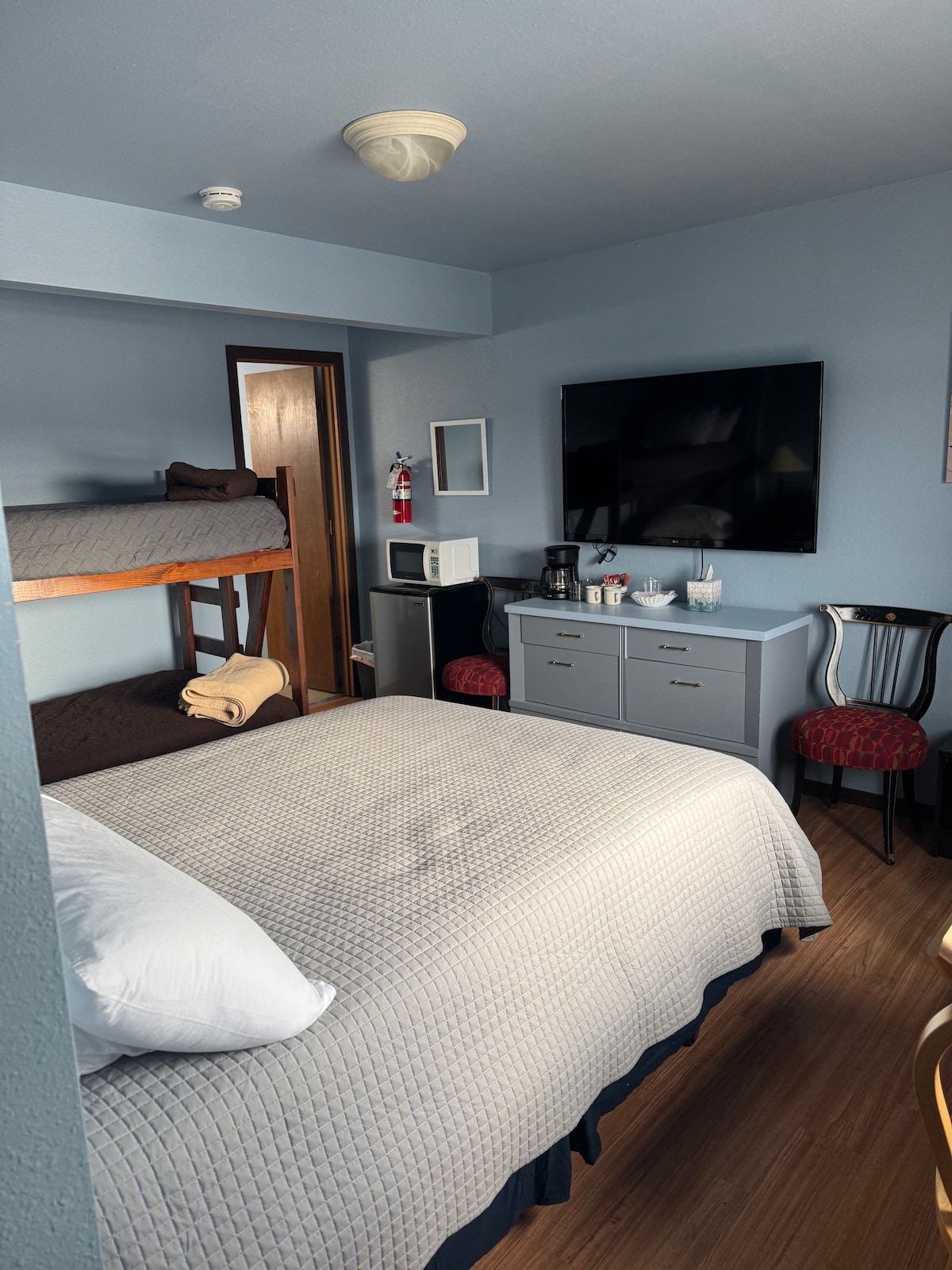 Pumunta at mag - enjoy sa aming moderno at natatanging bakasyunan! 3 minuto mula sa downtown Homer at 10 minuto mula sa Homer Spit. Malapit sa bayan sa isang tahimik na kapitbahayan na may mga tanawin ng Kachemak Bay. -1 King size na kama -1 banyo na may rain shower head - Buksan ang konsepto ng living area - Modern natural gas fireplace - Smart TV - Kumpletong kusina - High speed wifi (50mbps) - Libreng paradahan - Access sa key code - Nordic Spa na may hot tub, sauna, at cold plunge