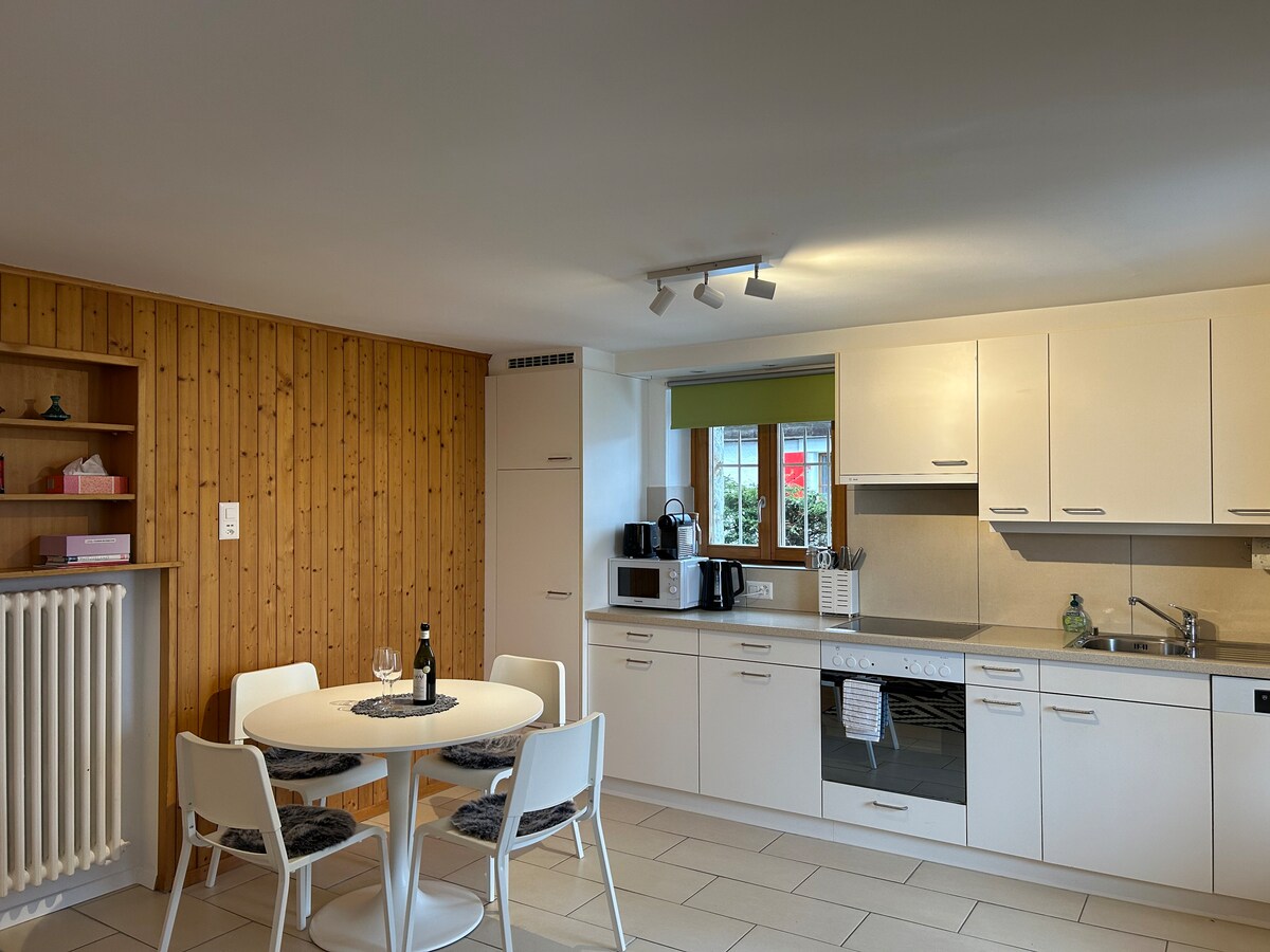 Halika at gumawa ng ilang mga alaala sa aming natatangi, maluwag at pampamilyang tuluyan. Matatagpuan 8 minuto sa itaas ng Montreux, tahimik kaming nasa pagitan ng malaking berdeng bukid at maliit na ubasan. Gumising sa mga nakamamanghang tanawin ng Lac Leman at ng summit ng Grammont at kunin ang iyong kape sa umaga o isang baso ng alak sa rooftop terrace:) Madali kaming mapupuntahan dahil 1 minutong lakad lang ang layo ng istasyon ng tren ng Planchamp mula sa pinto sa harap at mayroon kaming 1 libreng paradahan. Napakaraming paglalakbay na dapat isabuhay:)