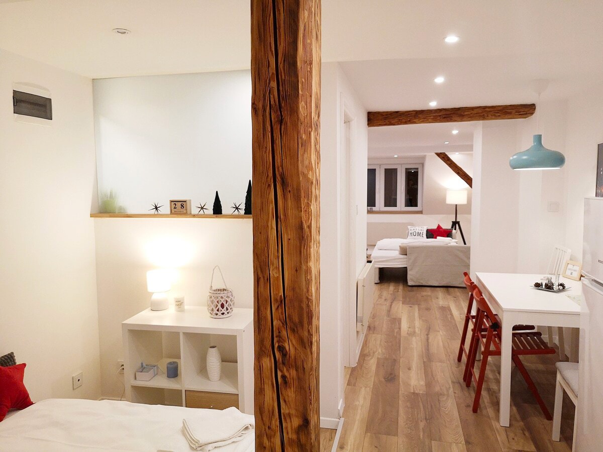 May BAGONG eleganteng apartment sa SENTRO NG LUNGSOD na wala pang 10 minutong lakad ang layo mula sa pangunahing parisukat at istasyon ng tren. Matatagpuan sa tahimik na bakuran sa pangunahing kalye para ma - enjoy mo ang mga tahimik na gabi. May isang silid - tulugan na may queen size na higaan, sala na may TV + NETFLIX at pull out sofa (queen size), banyo na may toiletette at maluwang na paglalakad sa shower na pinaghiwalay. Bagong - bago ang lahat ng muwebles at kasangkapan. LIBRENG tsaa at kape,LIBRENG tuwalya.
