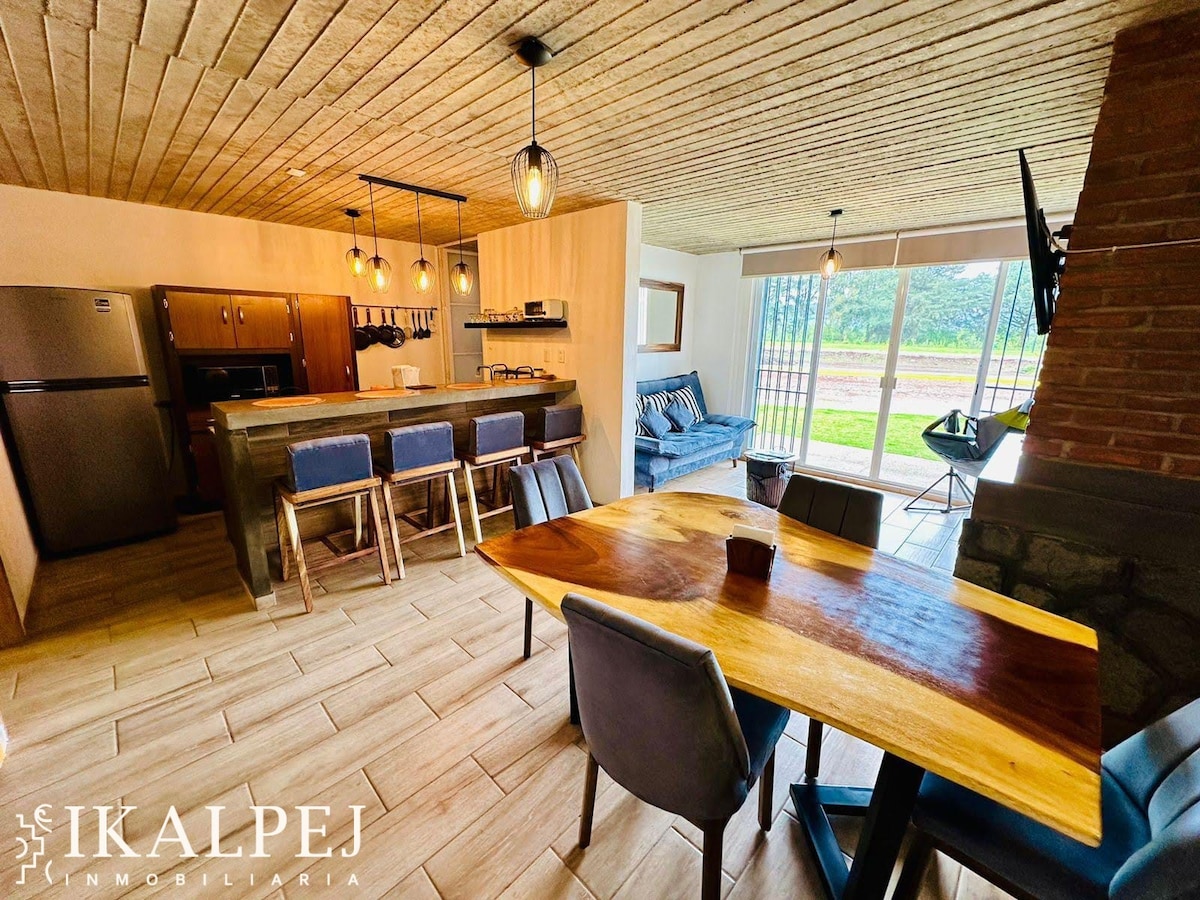 Nice Rustic house na may solar paneled climatized pool at Green landscapes, isang maliit na burol na maaari mong akyatin at mula sa tuktok nito ay humanga sa tanawin ng "El Cerro Del Muerto" sa kanluran, at sa silangan ay may malalawak na tanawin ng lungsod ng Aguascalientes. 3 silid - tulugan, isang tv room, 2 buong banyo, living at dining room, kusina at isang kiosco kung saan maaari kang magrelaks habang ang iyong mga anak o Kaibigan ay naglalaro sa pool.