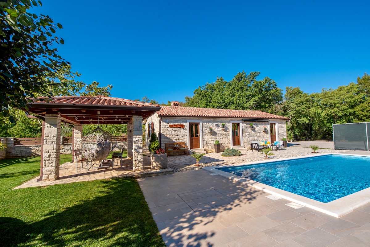 House Felicia with outdoor pool, located in a small and quiet place Čepić near Kršan, surrounded by only two neighboring houses, green meadows and vineyards. This house is ideal for those who want to relax in the countryside, with a beautiful view of the mountain Učka, or ride a bike and explore the surroundings in this way. The yard of the house is rich in children's content but with enough space for playing and running.