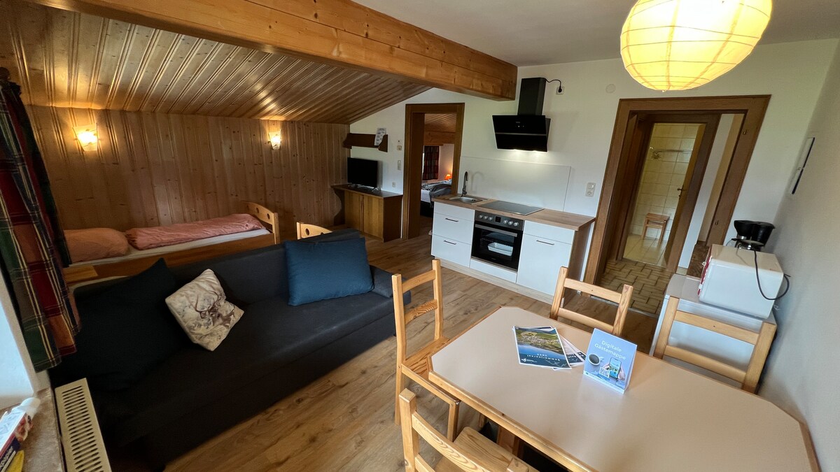 Ang aming farm Fichtern ay matatagpuan sa paanan ng Bichlalm mga 20 minutong lakad mula sa sentro ng lungsod at ang tahanan ng 15 kabayo at 2 ponies. Matatagpuan ang apartment sa attic na may dagdag na pasukan at nagtatampok ng sala na may sofa bed at balkonahe, silid - tulugan na may double bed, kusina na may dishwasher, electric stove, egg cooker, toaster, coffee maker. Banyo na may shower at bathtub at isang dagdag na toilet. Ang aming tubig sa gripo ay ang pinakamahusay sa mundo, hindi mo kailangang i - drag ang tahimik na tubig.