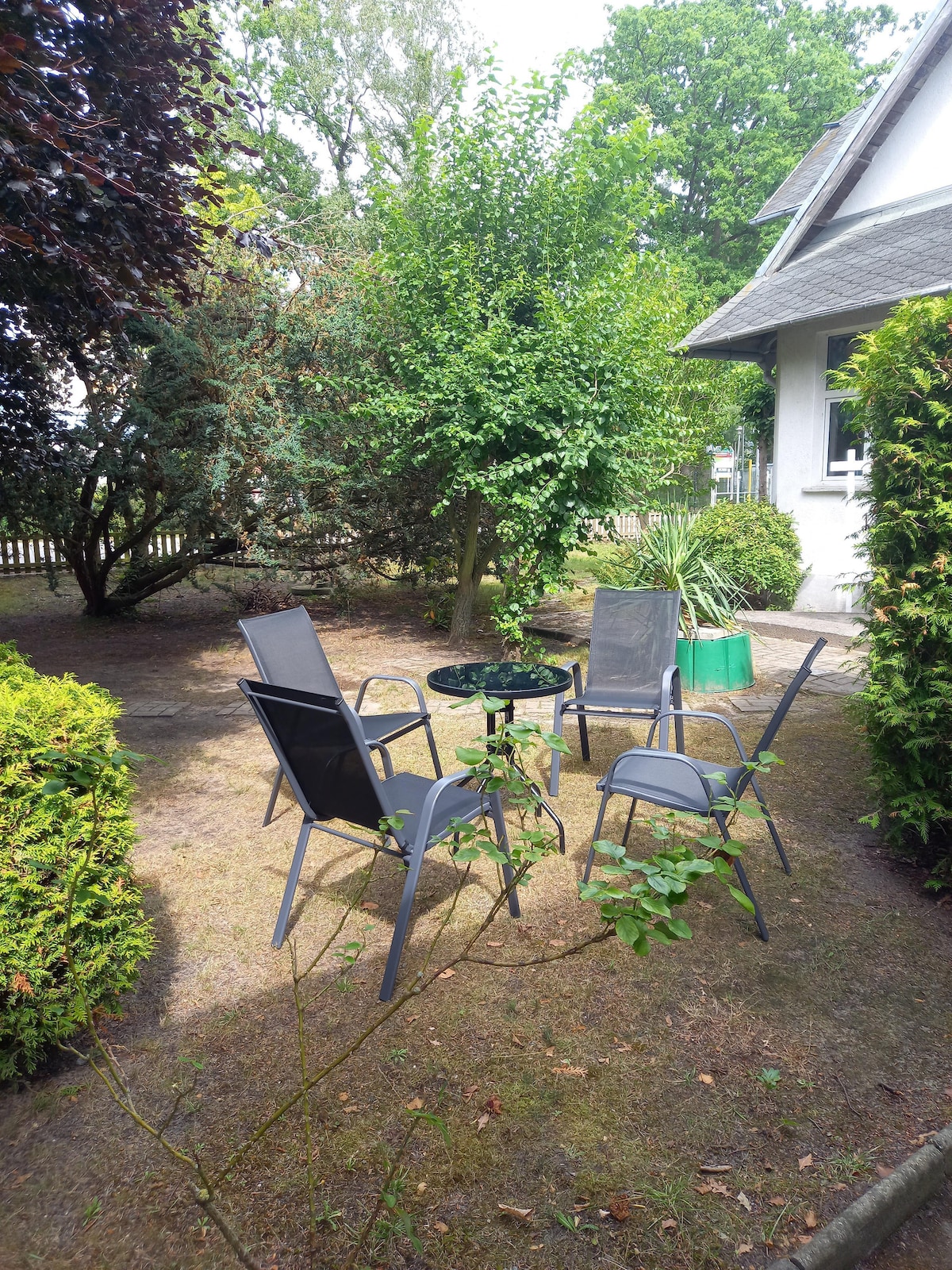 Ang aming holiday house ay matatagpuan sa holiday settlement Birkenhain sa gilid ng seaside resort Trassenheide sa isang tahimik at protektadong lokasyon. Sa gitna ng isang kagubatan ng birch, sa mga 500 metro kuwadrado na may isang bakod na napapalibutan ng hiwalay , hindi nakikitang lagay ng lupa, ay namamalagi sa aming payapang kahoy na bahay sa Sweden.