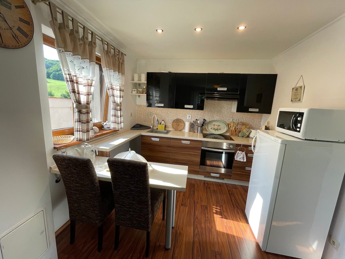 Matatagpuan ang apartment sa sentro ng Kremnica, 3 minutong lakad ang layo mula sa pangunahing plaza. Nag - aalok ang mga bintana ng magandang tanawin, na may Castle Church sa kanan at mga gumugulong na burol sa likod ng bayan sa kaliwa. Nagbibigay ang apartment ng komportableng matutuluyan para sa mag - asawa o para sa pamilyang may 4 -5 tao. Mula sa tagsibol hanggang taglagas, maaari kang mag - hiking o magbisikleta sa mga nakapaligid na bundok, habang sa taglamig ay masisiyahan ka sa pag - ski sa mga kalapit na ski resort. Nag - aalok din ang lungsod ng maraming atraksyong pangkultura at arkitektura.