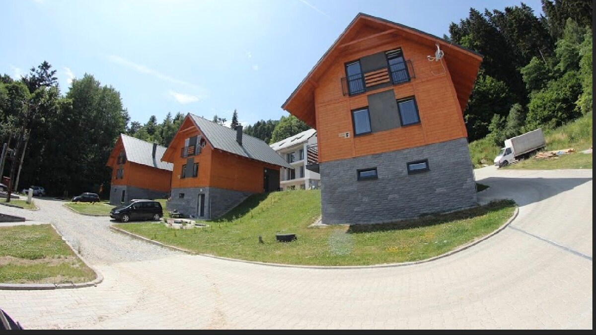 Matatagpuan ang aming kahoy na cabin sa pagitan ng dalawang ilog. Kaya ito ay isang kamangha - mangha at napaka - mapayapang lugar na matutuluyan. Sa ibaba, may pangunahing kuwarto, na may modernong kusina, refrigerator, washing machine, diswasher machine... may fireplace, na maaaring magpainit ng buong cabin. Ang malaking terace ay magandang lugar kung saan maaari mong tangkilikin ang iyong tasa ng tsaa o kape. ang hardin at surounding ay isang talagang magandang lugar para sa mga bata. at kung ang panahon ay magiging masama, thay ay marahil masaya mula sa swing mababa sa cabin... :-)