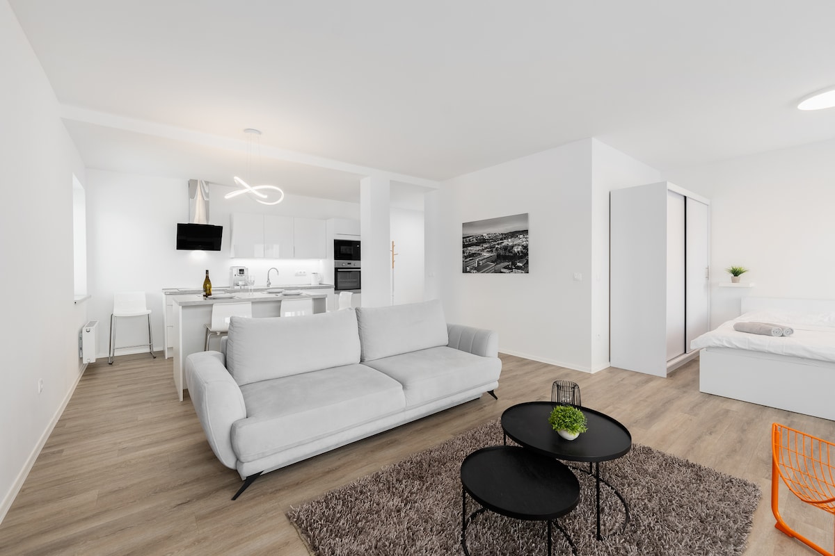 Maligayang pagdating sa aming naka - istilong, moderno, at bagong apartment na matatagpuan sa gitna ng Zlin! Matatagpuan sa sentro ng lungsod, ang lahat ay nasa maigsing distansya, na ginagawang maginhawa para sa iyo na mag - explore. Nagtatampok ang aming tuluyan na angkop para sa kapansanan ng balkonahe at malayo lang ito sa magandang parke ng Zlin. Mag - book na para sa isang kaaya - ayang pamamalagi!