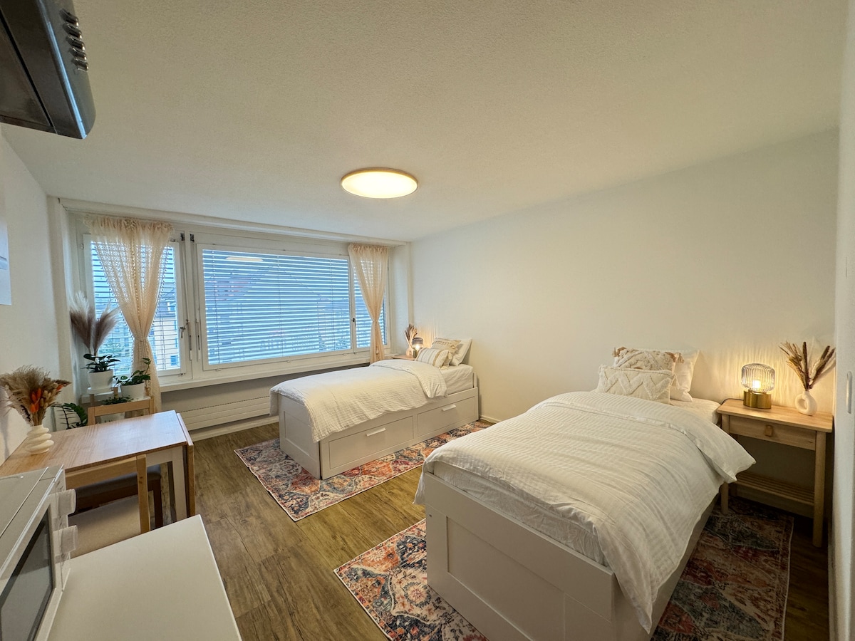 Ang studio ay 12 minuto mula sa Central Zurich sa pamamagitan ng Tram 2 at 3, bus 72 at 33 sa Albisriederplatz). Bahagi ito dati ng Crowne Plaza Hotel (katabi). May swimming pool at Fitness Gym sa tabi (karagdagang gastos). Ang studio ay may 2 single bed na maaaring pahabain para sa 3 o 4 na tao. Bagong kusina at puno ng mga accessary sa kusina. Walang TV at sofa. 1 minutong lakad ang layo ng Migros (Swiss grocery)
